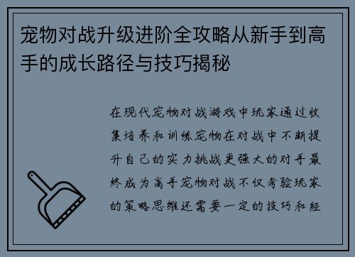 宠物对战升级进阶全攻略从新手到高手的成长路径与技巧揭秘